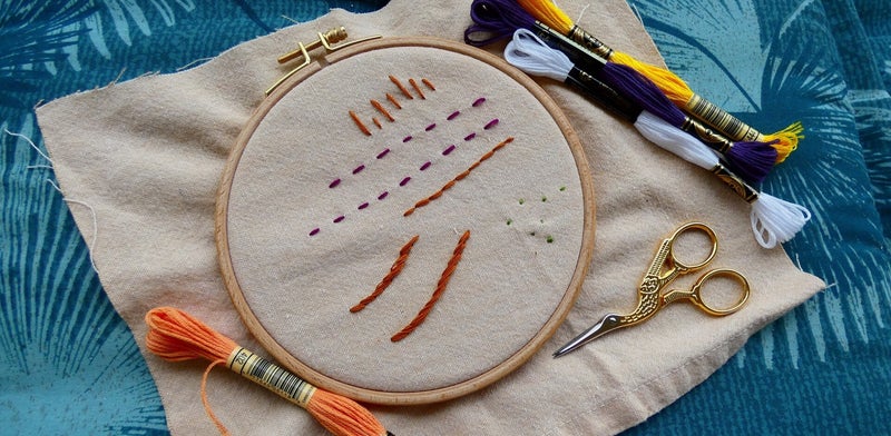 Pour votre entraînement, vous aurez besoin d'un petit tambour, de fil DMC, d'une aiguille à broder, de ciseaux et d'un peu de toile de coton. Pour broder un point droit, vous pouvez tracer un trait au crayon à papier et suivre la ligne. Cela apporte plus de facilité. Les points plats peuvent être brodés à des longueurs différentes et être regroupés avec d'autres points pour créer des combinaisons variées. Vous réaliserez aussi bien des tâches de couleur, que des bordures et contours.