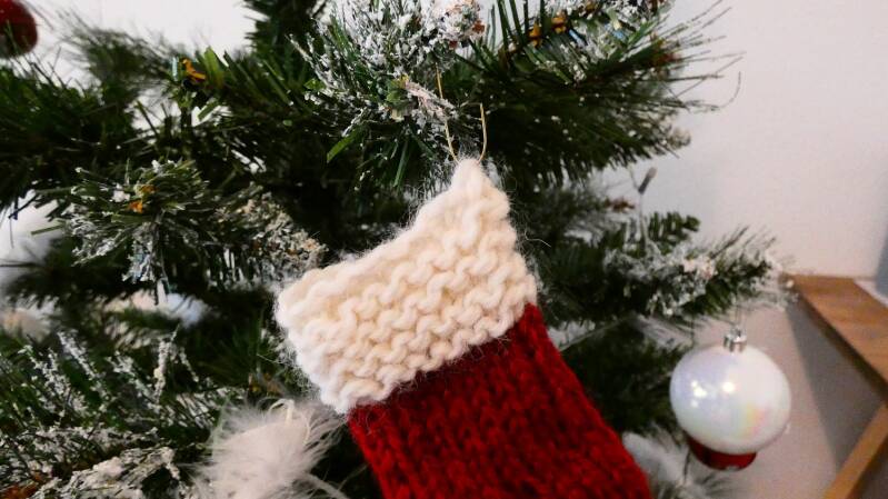 Coupez le fil blanc et passez à la laine rouge. Tricotez 10 tours en jersey endroit (fil rouge jusqu'à la fin de la chaussettes).