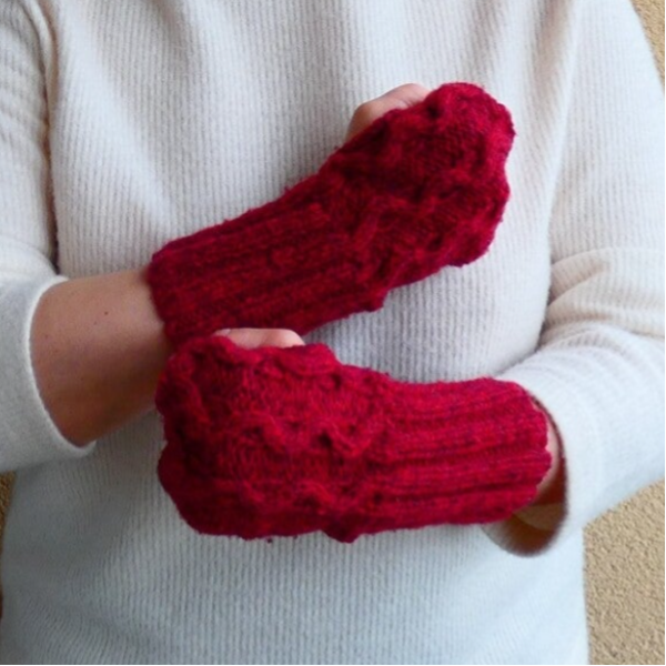 Jolies mitaines ornées de trois torsades "serpent" sur le dessus de la main. C'est un modèle de ma conception, tricoté à la main aux aiguilles droites (couture sur le côté) en laine de mouton brute d'Ardèche. Une laine un peu rêche mais pas désagréable à porter pour autant. Une belle couleur rouge bordeaux. Une laine ni fine ni grosse. Cet accessoire sera utilitaire, pratique, réchauffera vos mains tout en gardant le toucher. Parfait pour les femmes aux peaux peu sensibles.